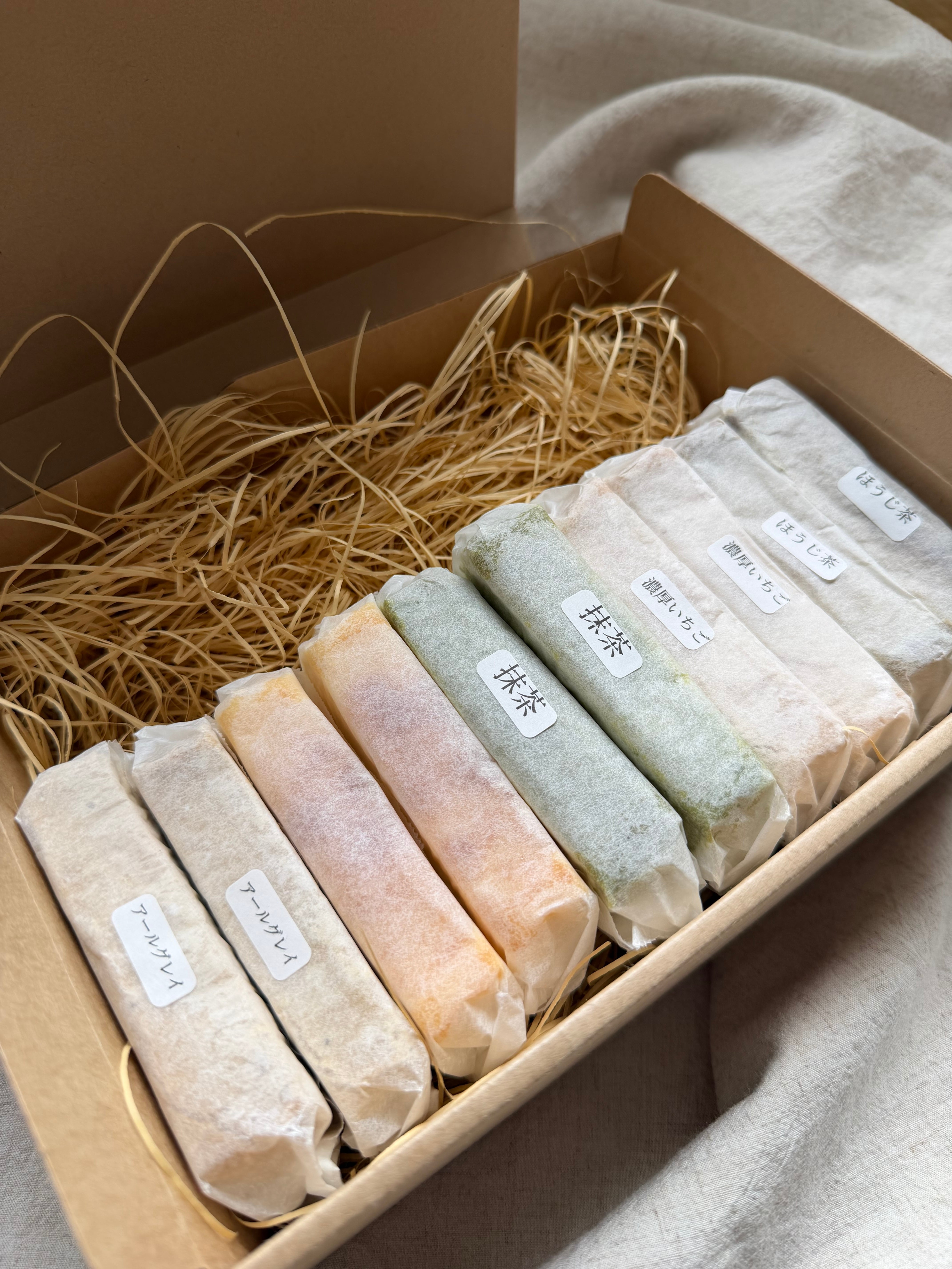 (プレーン×2、アールグレイ×2、濃厚いちご×2、ほうじ茶×2、濃い抹茶×2)